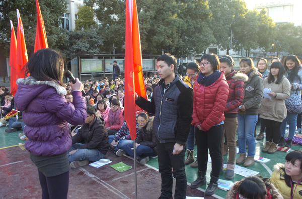 1月21日下午,我校高三年級師生齊聚學(xué)校運(yùn)動場,召開高三年級期末考試表彰暨班級競爭挑戰(zhàn)大會。會議由教導(dǎo)處主任何志平主持。會場班旗招展,學(xué)子群情激昂,時(shí)值隆冬,但場面熱烈,讓人熱血沸騰。教導(dǎo)處主任何志平首先對高三年級期末統(tǒng)考進(jìn)行了全面總結(jié),在剛剛結(jié)束的元月統(tǒng)考中,我校高三年級文理科過一類線人數(shù)突破700大關(guān),高達(dá)754人,其中理科過一類線513人,文科過一類線241人,應(yīng)屆生569人,遠(yuǎn)超其他兄弟學(xué)校,與四中、五中一道鼎立襄陽。何主任還對高三年級后一階段管理和學(xué)習(xí)提出了具體的措施和要求。在本次統(tǒng)考中,孫愛勇領(lǐng)軍的高三B級部過一、二類線人數(shù)超過A級部,被學(xué)校授予“優(yōu)秀級部”稱號。學(xué)校領(lǐng)導(dǎo)給期末統(tǒng)考文、理科前50名,本學(xué)期四次大考中均戰(zhàn)勝競爭對手且過一類,四次大考中均戰(zhàn)勝競爭對手本次暫未上一類等各類優(yōu)秀學(xué)生頒發(fā)了獎(jiǎng)品。本次統(tǒng)考中的優(yōu)秀學(xué)生和班主任作了典型發(fā)言,特別值得一提的是,孫虎所帶的高三(20)班單班過一類高達(dá)80人,再次刷新我校該項(xiàng)歷史紀(jì)錄。在本次統(tǒng)考中班級競爭暫未獲勝的班級給獲勝的班級頒發(fā)“優(yōu)勝班級”獎(jiǎng)牌,勝者猶有“王者在上,舍我其誰”的霸氣,輸者更有“不把你拉下馬,誓不罷休”的豪情。大會的高潮出現(xiàn)在班級之間的競爭挑戰(zhàn),在本次統(tǒng)考中班級競爭暫未獲勝的班級代表們爭先恐后地走上前臺,他們或慷慨陳情,或痛心不已,或信心滿懷,代表或帶領(lǐng)本班學(xué)生表達(dá)了不甘落后的決心。最后校長段銀橋作了重要講話,對高三年級統(tǒng)考成績給予了充分肯定,并對高三今后的工作提出了指導(dǎo)性的意見。